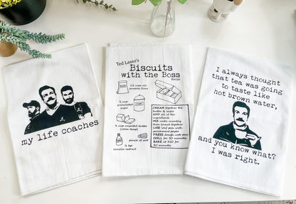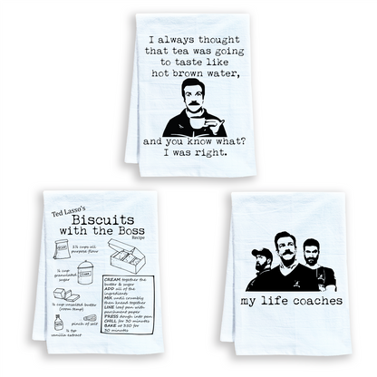 Kitchen Towel Set of 3 ~ Life Coaches, Biscuits, Hot Brown Water ~ White (Ted Lasso)