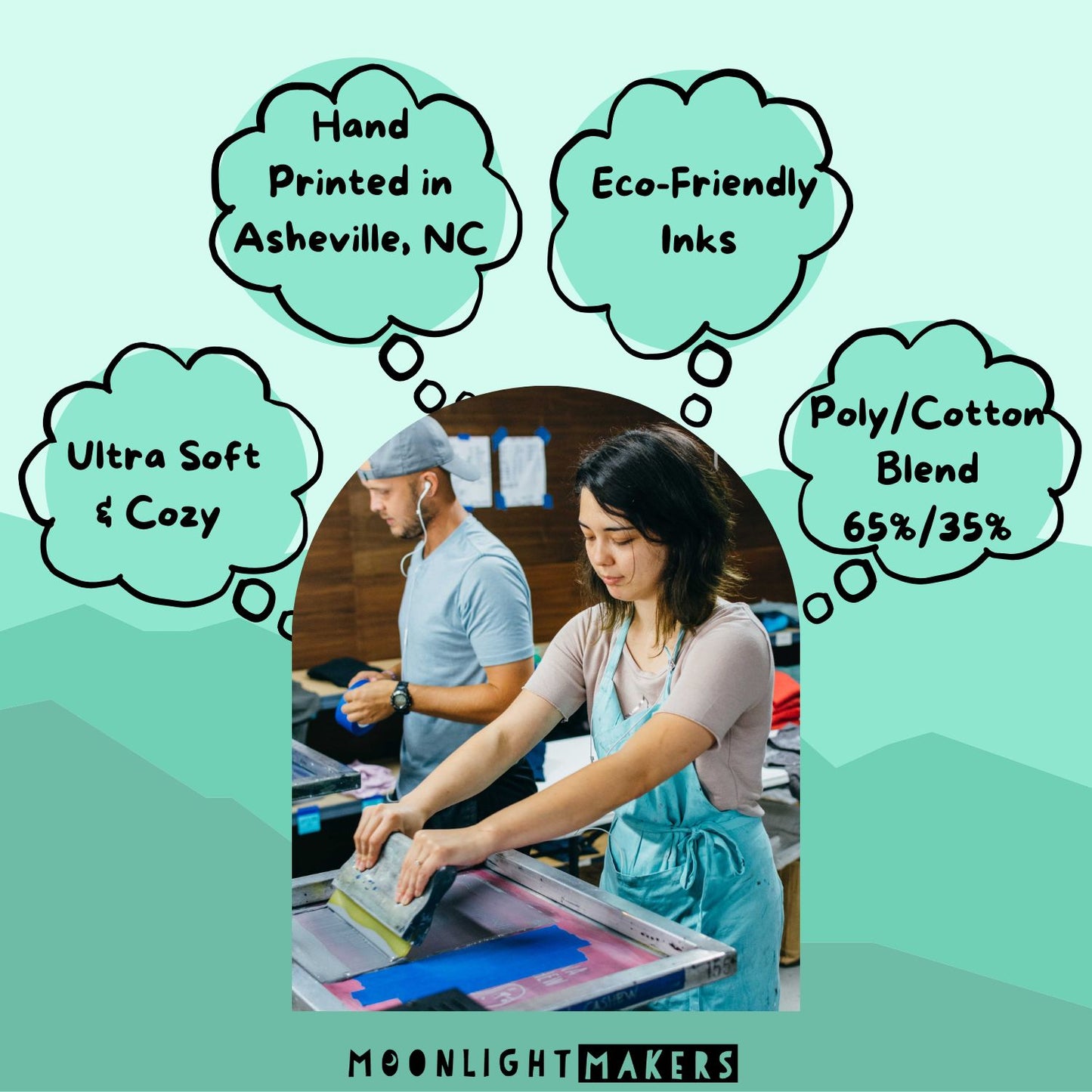 These shirts are so soft and comfortable! Materials: 65/35 polyester/combed ring-spun cottonThis is a Moonlight Makers original design and all our shirts are screen printed by hand in our Asheville, NC Studio. Average time between placing your order and us shipping it out: 1 business day! Contact us for bulk custom and wholesale inquiries.